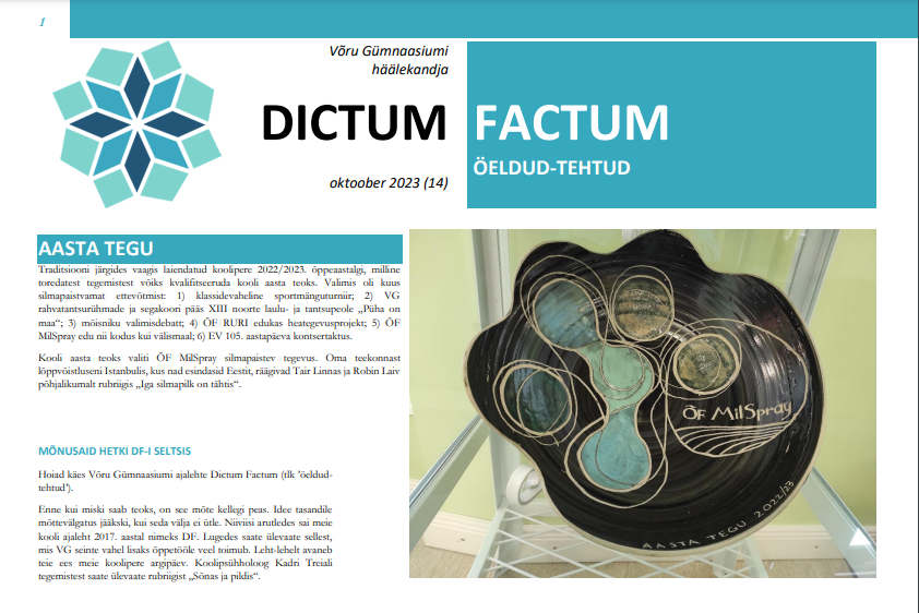 Ilmunud on järjekordne Võru Gümnaasiumi häälekandja Dictum Factum. Lugedes saab ülevaate sellest, mis Võru Gümnaasiumi seinte vahel lisaks õppetööle veel toimub. Mõnusat lugemist! Varasemaid numbreid saab lugeda siit.
