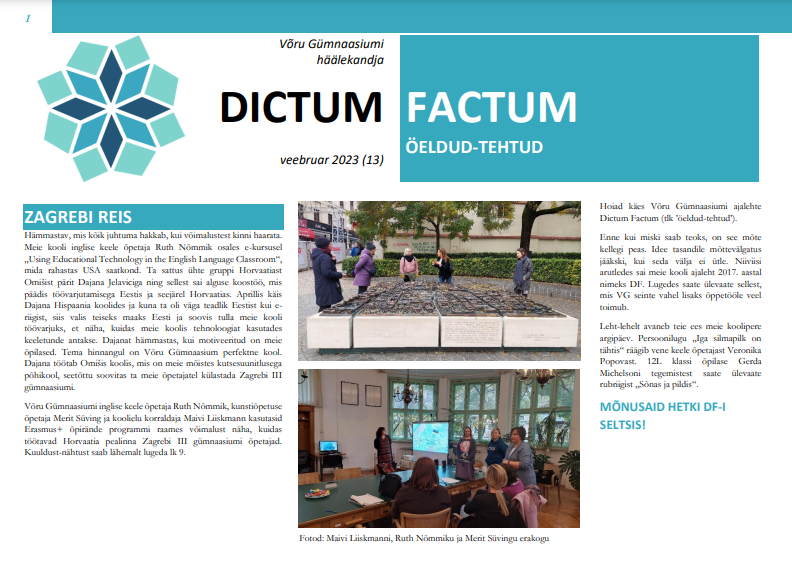 Ilmunud on järjekordne Võru Gümnaasiumi häälekandja Dictum Factum. Lugedes saab ülevaate sellest, mis Võru Gümnaasiumi seinte vahel lisaks õppetööle veel toimub. Mõnusat lugemist! Varasemaid numbreid saab lugeda siit.