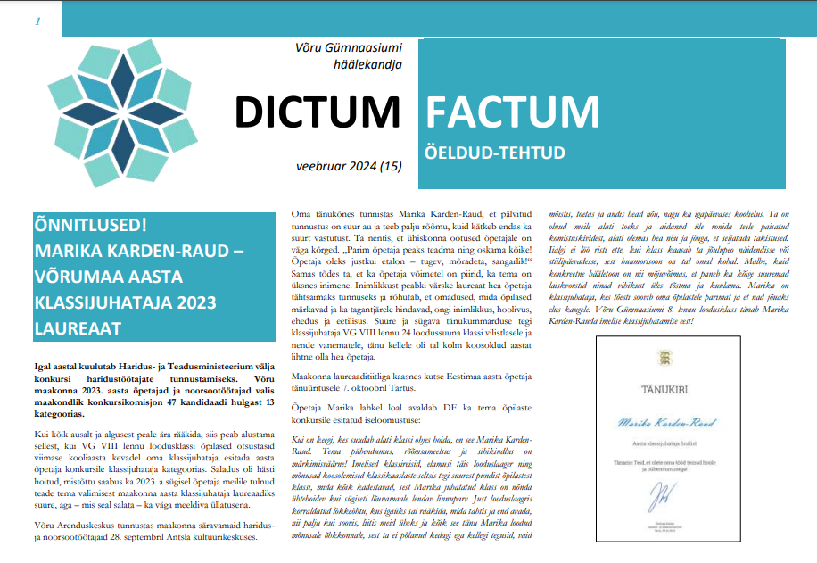 Ilmunud on järjekordne Võru Gümnaasiumi häälekandja Dictum Factum. Lugedes saab ülevaate sellest, mis Võru Gümnaasiumi seinte vahel lisaks õppetööle veel toimub. Mõnusat lugemist! Varasemaid numbreid saab lugeda siit.