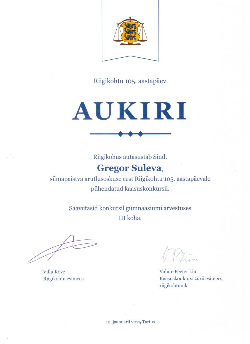 Gregor Suleva saavutas Riigikohtu kaasuskonkursil III koha