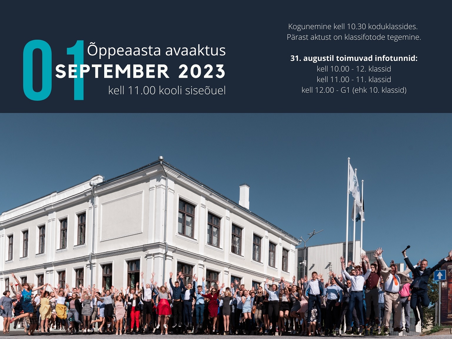 Koguneme aulasse (II korrusel). 11.-12. klassi õpilaste infotund kestab ~ 1 tund, millele järgneb klassijuhatajatund. G1 õpilaste infotund kestab ~ 1,5 tundi, millele järgnevad mentortund, õpperühmade nimekirjade tutvustamine, õpilaspiletile foto tegemine ning ühistegevused (sh söömine, mis on kooli poolt korraldatud ja tasuta). G1 õpilased peavad arvestama, et ühistegevused lõpevad orienteeruvalt kell 18.00.