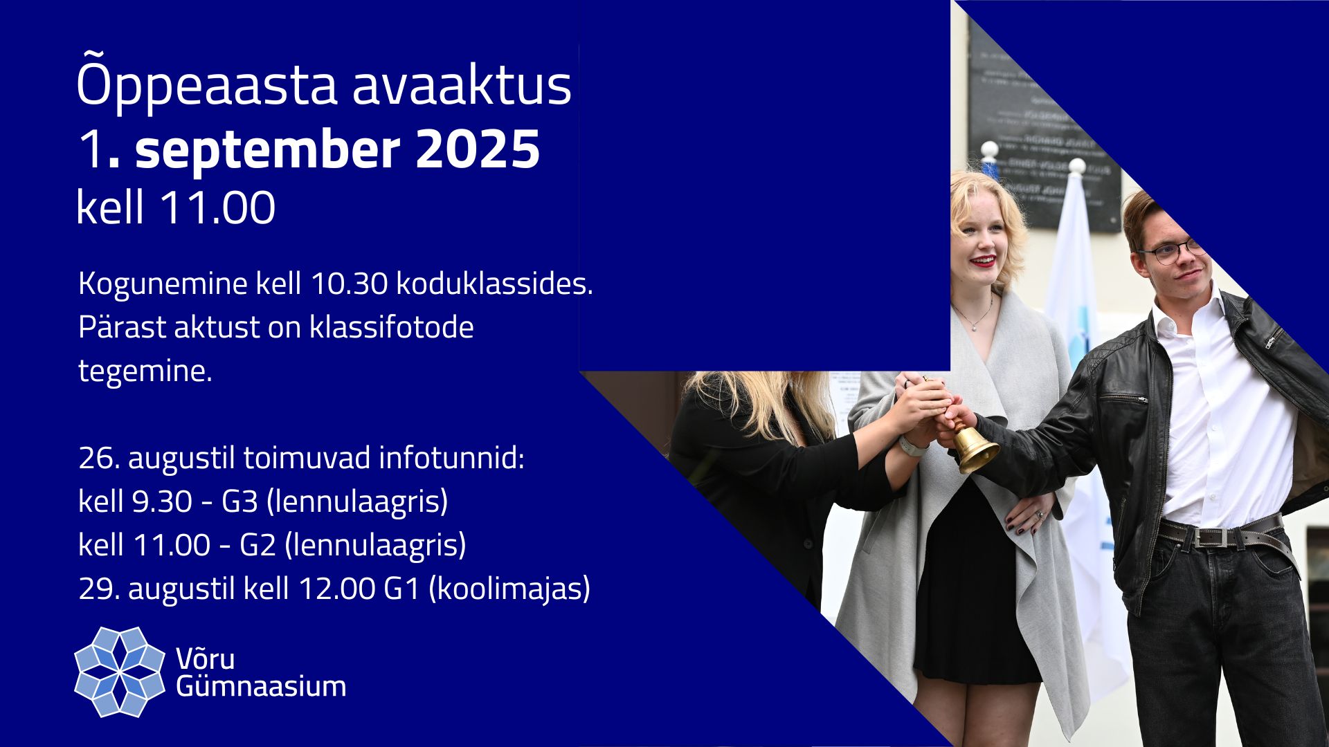 Võru Gümnaasiumi 2025/2026 õppeaasta avaaktus toimub 1. septembril kell 11.00. Aktus toimub õues, vihmase ilma korral kooli aulas.