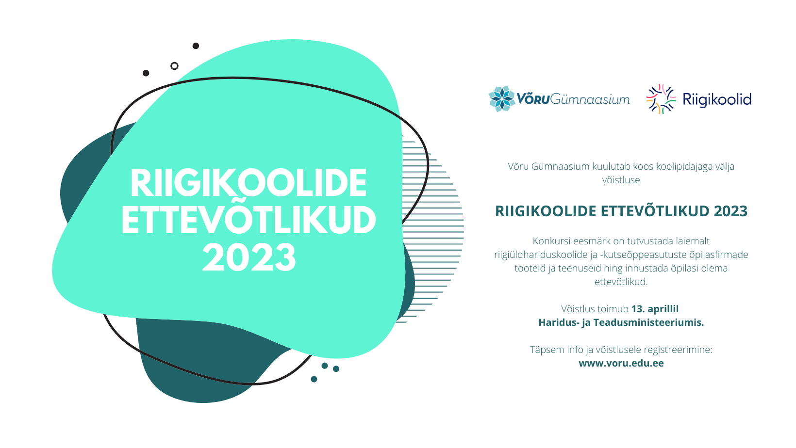Juba kolmandat korda kuulutab Võru Gümnaasium koos koolipidajaga välja võistluse „RIIGIKOOLIDE ETTEVÕTLIKUD 2023“. Konkursi eesmärk on tutvustada laiemalt riigiüldhariduskoolide ja -kutseõppeasutuste õpilasfirmade tooteid ja teenuseid ning innustada õpilasi olema ettevõtlikud.