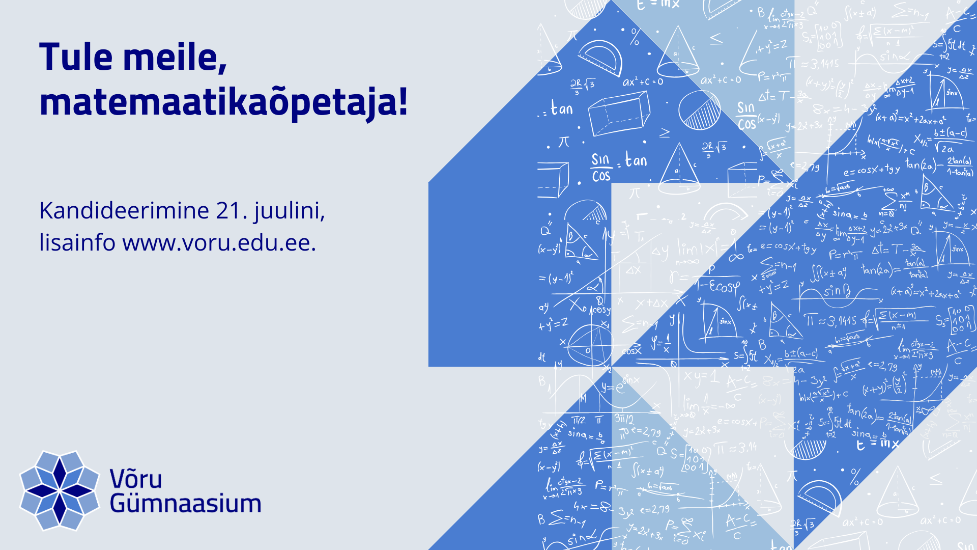 Võru Gümnaasium kuulutab välja matemaatikaõpetaja töökuulutuse. Tähtaeg kandideerimiseks 21. juulini (k.a) läbi Töötukassa keskkonna või saada nõutavad dokumendid e-maili gymnaasium@voru.edu.ee vahendusel.